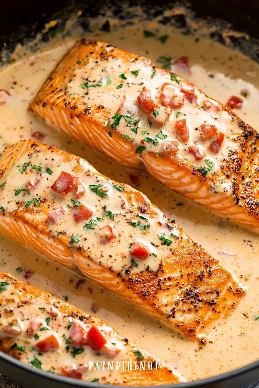 Saumon poêlé dans une sauce crémeuse au poivron rouge et au parmesan